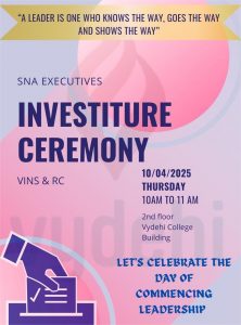 The Investiture Ceremony – 2025 of Vydehi Institute of Nursing & Research Centre was tentatively planned and conducted on 10th April 2025 from 10:00 AM to 11:00 AM at the 2nd Floor Corridor. The ceremony was organized with the objective of formally conferring responsibilities on the newly elected student representatives and fostering leadership qualities among students.